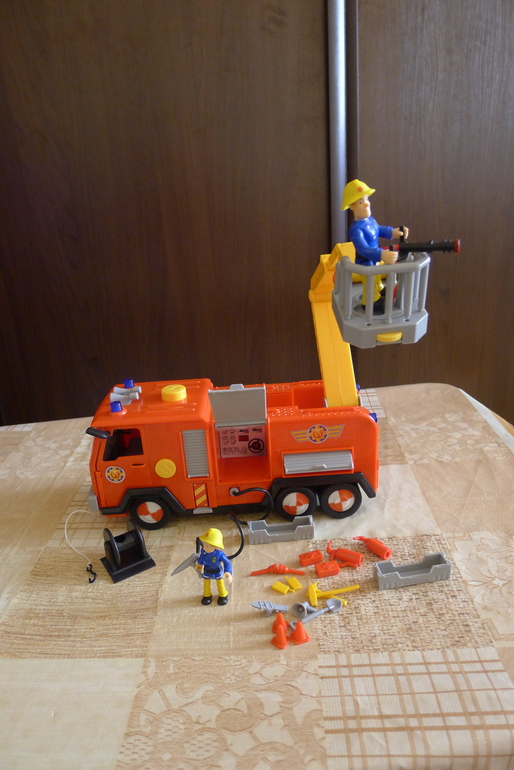 Есть выдвижная лестница, в люльке можно поворачиваться при тушении пожара. Машина стреляет водой. Струя дальняя, хорошая. Сначала надо прокачать - несколько раз нажать. Как вода польется, достаточно 1 раз нажать, чтоб была хорошая струя. Человечек крепко держится в люльке, не падает даже если стоит вниз головой. Свет и звук как в мультике Пожарный Сэм.