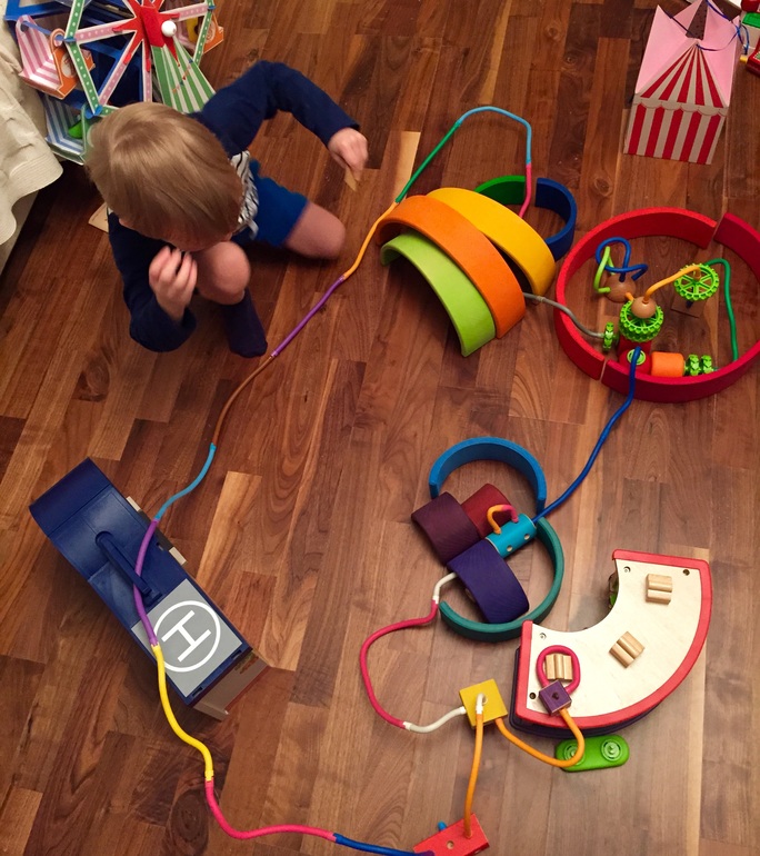 У нас есть такой - Wavelay - покупали на др на 3 года. Иногда играет, но не конкретно с этим конструктором, а вместе с другими. Покупали с палочками гнущимися и второй набор с резиновыми элементами мягкими (они между собой стыкуются). С деревянными интереснее.