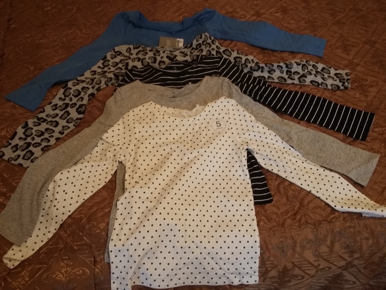 Лонгсливы: горловина тоже широковата, а рукава узкие, дочке неочень это понравилось, по росту хорошо. Из пяти 3 - 100% хлопок, 2- 92% вискоза/8% эластан. Когда открыла пакет вышел резкий запах, после стирки, надеюсь, будут приятно пахнуть ))))