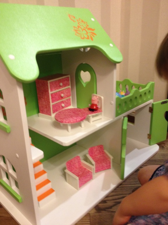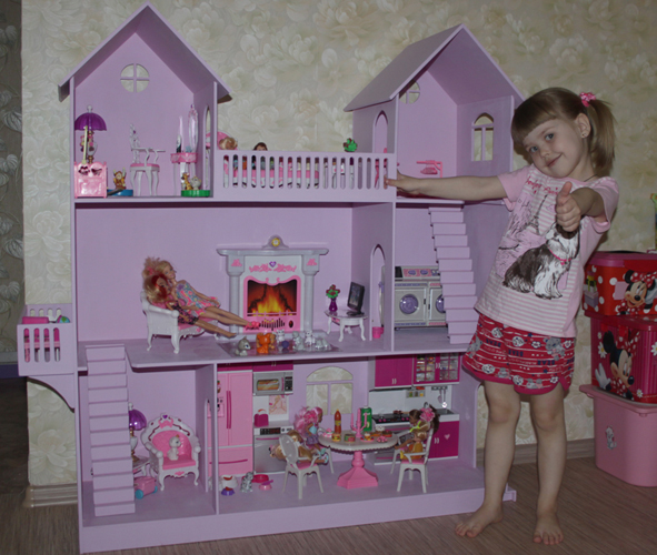 А у вас самим сделать некому? Папа не сможет? Муж купил толстую фанеру, в магазине сделали основные распилы, там же сделали колорирование краски в тот цвет ,который выбрала дочь. Ну пришлось мужу немного повозиться с лестницей и балконом, но не так и много времени заняло все. По цене вышло 2000 рублей. Дочь ростом 106 см. Можно же сделать на 2 этажа и без лестниц, проще и дешевле получится. Сделать только проходы между комнатами и дверь.