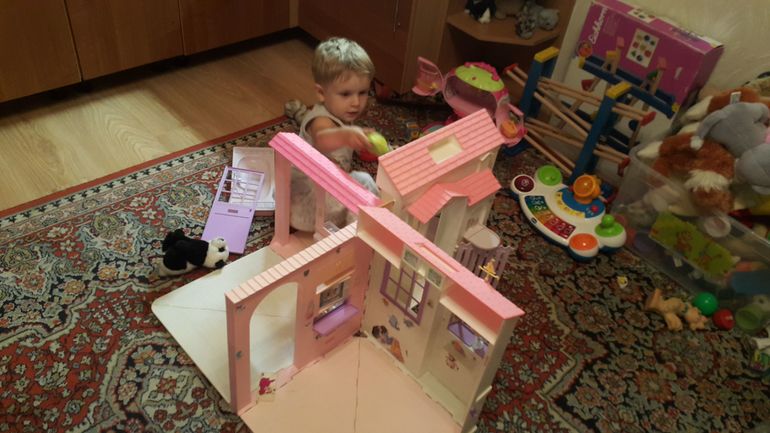 Другого фото нет, домик на даче. Так не видно, но там двери, окна, калитка, ванна-кровать, лампа, телевизор, шкафчики, кухня с раковиной, плитой, столом и всякие наклейки на стенах, типа банок с вареньем. Все это плоско-складное, домик складывается, но все равно конечно много места занимает.