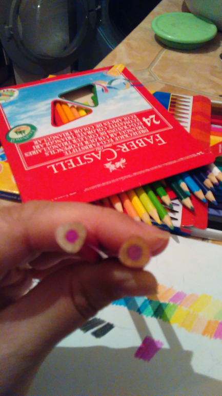 Яркие, достаточно мягкие, но очень быстро стачивается грифель, в процессе приходится подтачивать. Такие они стали за месяц неактивного пользования(мои художники требуют краски). И да, грифель не ломается! А мы постучать любим!