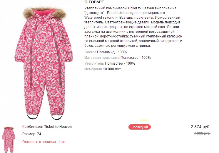 Верхнюю одежду всю нужно в распродажи приобретать. К сожалению цены на все очень большие. Но керри лучший. Еще аналогично по качеству и теплоте хуппа. ее можете на озоне посмотреть и юлмарт. Авито можно помониторить. Но в любом случае от 74р. и больше дешевле 4000т. вы не купите хороший новый комбез. То что было в мазе-это размер 56 и 62, на них всегда можно скидки найти.