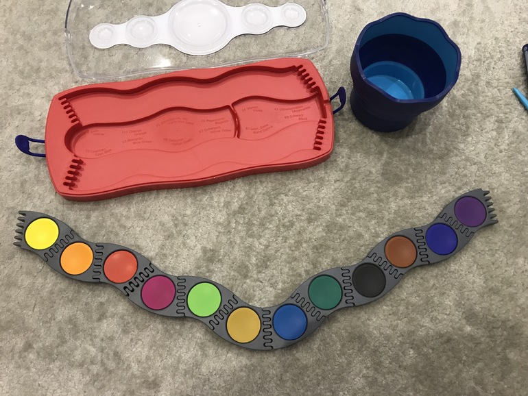 Какие они классные .... и огромные)коробка хоть и лёгкая, но длинной см 25-30. На крышке есть палитра. Сами краски можно вытащить и сложить в любую фигуру. Отстирываются ))))))