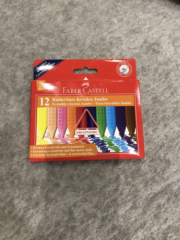 Для рисования и занятий куплены были восковые мелки. Тоже отстирываются с одежды , трехгранные , СТИРАЮТСЯ ластиком. Сын, который ошибается на занятиях очень оценил)))
