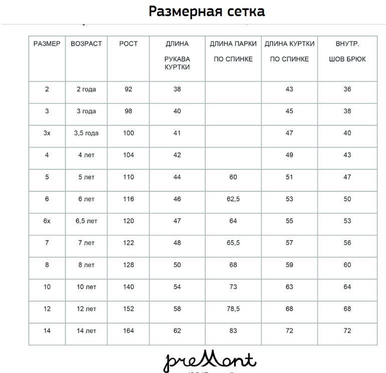Размеры Премонт