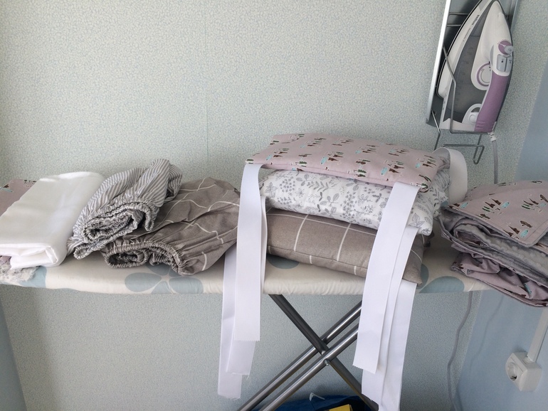 Также в той же икее есть бортики. Они сами по себе не оч презентабельные) но очень хорошей высоты. Плюс, икеевские - не отдельными подушками, а лентой. Это, в итоге, оказалось лучше (за два года до своих родов оформляла кровать сыну подруги: тогда шила отдельные подушки, ребенок просовывал ноги. Себе сразу решила делать цельнокройный борт)