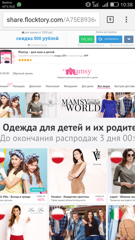 Распродажи. Скидки. Акции.На флоктори нашла скидку по промокоду Gift_500 на 500 рублей при сумме от 2500 в магазине Mamsy