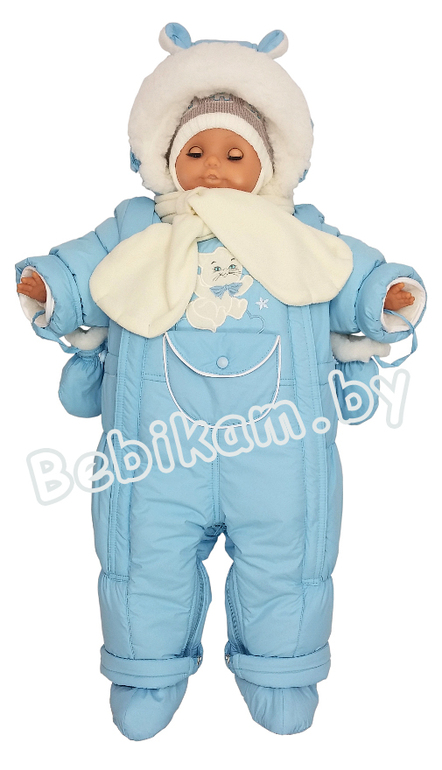 Практичный и теплый зимний комбинезон для Вашего ребенка. Легко трансформируется в конверт. Две длинные молнии расстегиваются почти полностью для удобства одевания малыша. Рукавички соединены тесьмой. Пинетки пристегиваются к комбинезону при помощи кнопок.