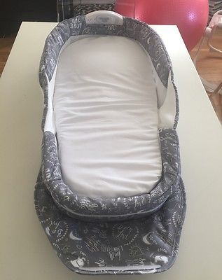 У нас была похожая вещица. Называется мобильная кроватка Baby Delight Snuggle Nest Surround, очень меня выручала. Это своего рода гнездышко для новорожденных, только бортики твердые, плюс дно твердое, это куда более полезнее для спинки ребенка. Там сверху ночничек и музычку можно включать ( она тихонечко играет ).
