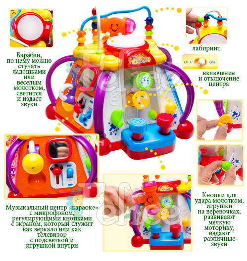 У нас такой) сыну на годик дарили, ему нравится,одна из любимых игрушек) звук издают только кнопочки для удара молоточком,а веревочки не играющие) единственный минус- микрофон очень слабый, голос не слышно,только если подуть в него слышно шипение.
