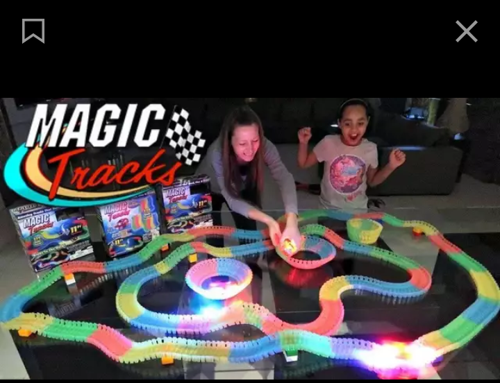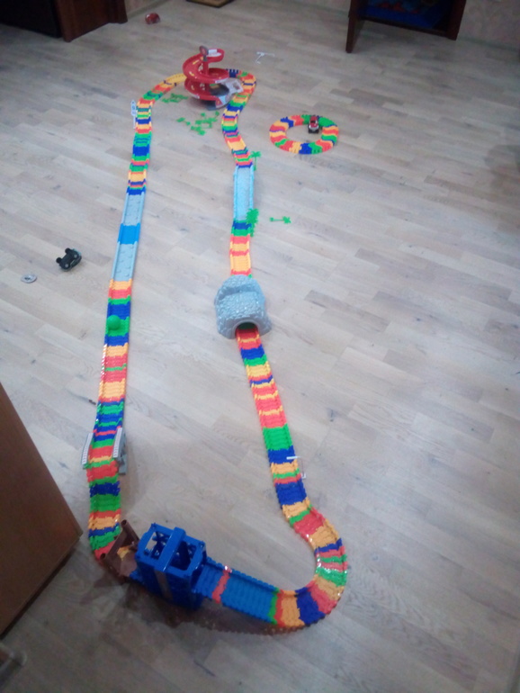 Второй набор Magik track там светится и машинка ( быстро садится батарейка) и сам трек светится, если полежит на солнце или лампой. В общей сложности в двух наборах около 200 деталей, нам мало!!! На НГ еще дарим набор и доп машинки