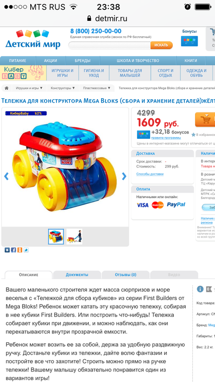 Лего купила, а вот тележку мега блока отменили. Лего очень долго собирали, потом искали, мы с ребенком два раза напоминали, что ждём, в итоге всё-таки вынесли. Кстати в отзывах на сайте детского мира прочитала, что Лего был за 899 рублей ещё в начале октября, так что видимо он давно со скидкой.