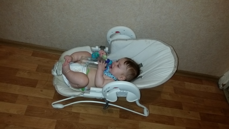 Мы искали с плоским дном и легкую, чтоб я сама после кс могла ее по квартире переносить без напрягов. В ней есть вибро, три варианта мелодии, игрушки, зажигающиеся лепестки (мигают поочередно). "Музыкальный цветок" можно совсем снять или сдвинуть в бок. Плюс можно и спинку регулировать в дальшейшем. Три положения. Можно выдвинуть ножки и она ровно стоять будет, не на овальных полозьях как на фото.