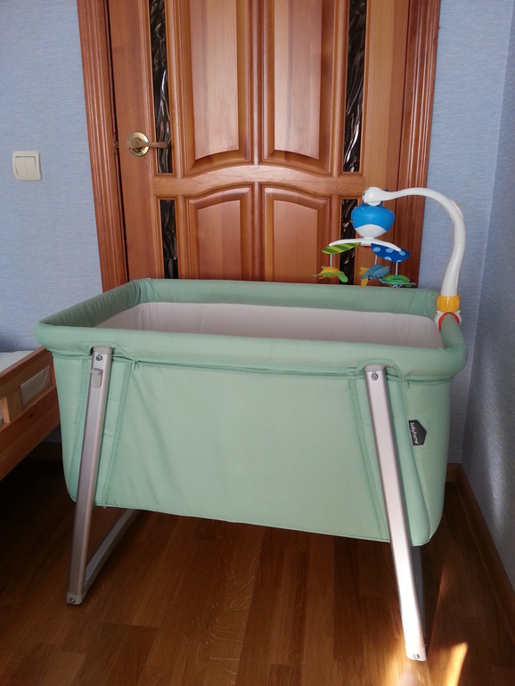 У нас такая колыбель была, заказывали кокосовый матрас, сначала на колёсики ставили, сейчас так стоит.