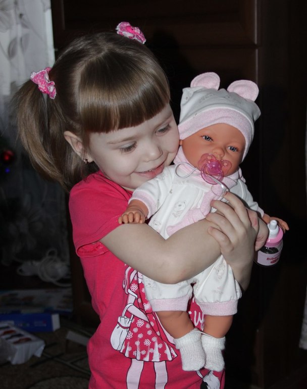Вот мы хотим пока малыша, только побольше размером, но обязательно без волос, у нас есть куколка-принцесса Дисней с длинными волосами, дочка пока не проявляет интереса чтобы ей прическу сделать или расчесать, а вот куколок-малышей любит нежно) видимо возраст такой сейчас!