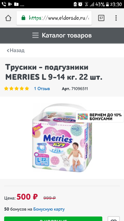 Это к сожалению только мск и область, а в регионы они не доставляют(( а здесь +50 бонусов, так что грубо говоря 450 руб за пачку. У нас дешевле я не видела меррисы, а мы если в памперсах, то только в них