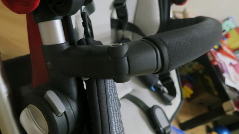 Но про бампер тоже стоит упомянуть. У Cruza он поворотный и откидной, можно закрепить и снять одной рукой - это будет бонусом для сам непосед и для тех, кому надо уделять внимание ещё и старшим детям на прогулке. Малышу можно смело давать печеньку или банан - бампер в чехле, который можно снять и постирать.