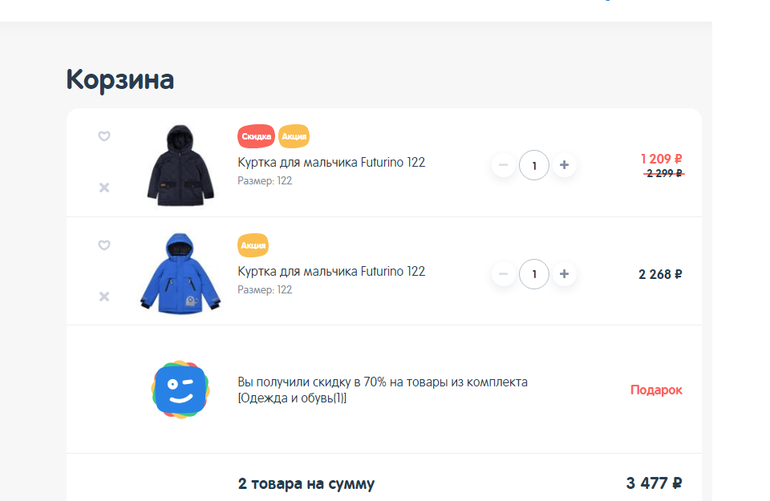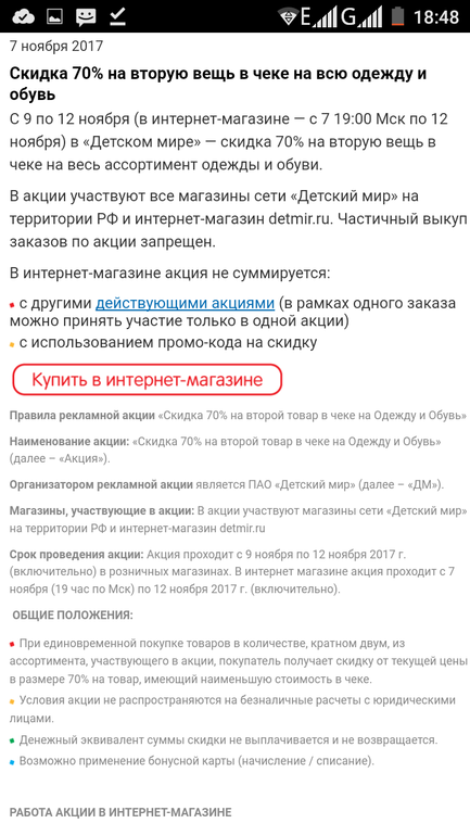 Акция еще очень и очень сырая! Смотрите сами - во первых соимость куртки в корзине и на сайте разная, скидка посчиталась от наиболее дорогой вещи, и она далеко не 70%. Позвонила в ДМ на горячую линию - сказали передали вопрос руководству, предложили подождать решения онлайн. Отказалась. ДМ в последнее время очень разочаровывает... Увы..