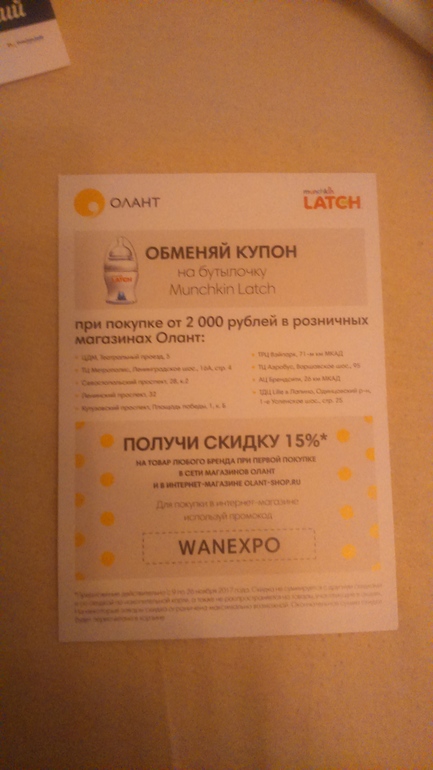 Спасибо! Промокод WANEXPO даёт скидку 15% в интернет магазине на любую покупку, у меня на коляску сработал)) при том что я покупаю не первый раз там и в личном кабинете даже высвечивается моя скидочная карта