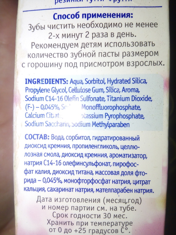 В составе есть фтор. Ещё не понравилсь что ОЧЕНЬ много пены образуется, не нет да и проглотишь пловину. Тюбик выкинули.