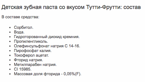 У нас сейчас такая зубная паста babyline тути фрути и состав отличный от вашего: