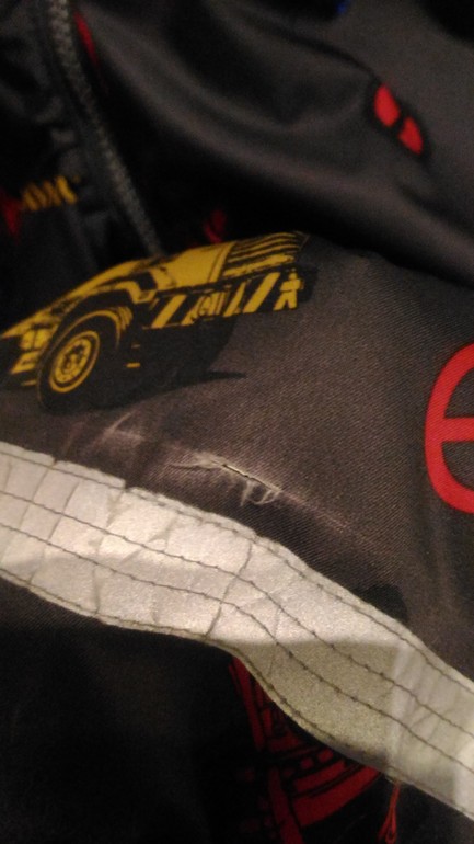 Я бы обрезала торчали нитки и оставила так. Всё же комбезу три года. Хотя может кто что дельного и подскажет. Можно конечно пустить ещё одну светоотражающую полоску, но это уже проблемнее.