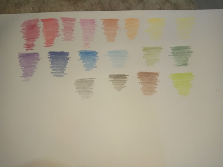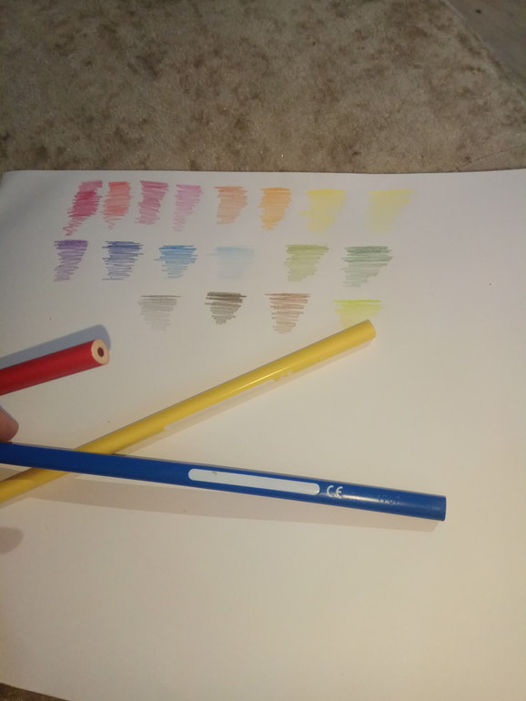 , сами карандаши трехгранные, очень удобно лежат в руке. Рисуют мягко. Цвета, я б не сказала что очень яркие, но приятные глазу.