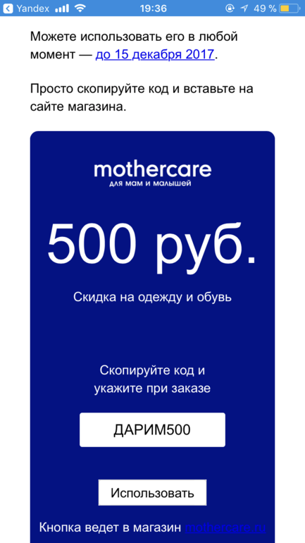 Скидка действует для любых заказов на сумму от 5000 ₽ на сайте mothercare. Не суммируется с другими скидками.