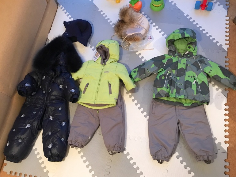 Олени с али 😂 (легкий), белый Chicco (довольно теплый), синий Manudieci (очень теплый), желтый Playtoday (очень теплый), зеленый Reima куртка + Reike полукомбез (средний по теплоте).