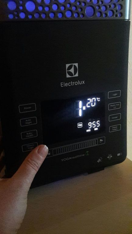 У меня такой,только пульт-метеостанция в комплекте не шёл.Я не занимаюсь йогой, но по технике подышала,сразу нелегко ))) Налета намебели нет,там стоит фильтр+воду тоже фильтрованную заливают.В ночном режиме подсветка не горит,только время.