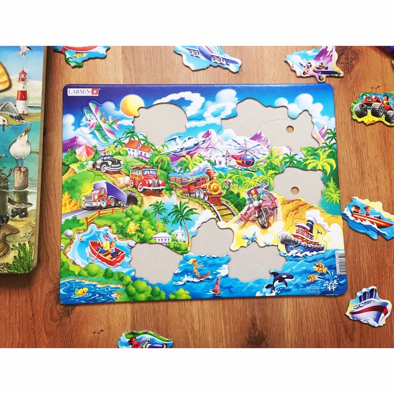 🐳В 2,2 г. мы стали счастливым обладателем большого пазла Larsen 18 деталей. Классный пазл, что сказать. У него есть основа, картинки очень красивые. Правда немного смущает серая картонка основы и задней стороны деталек.