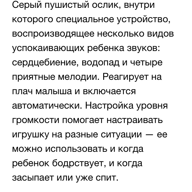 Вообще ребнок засыпает в основном с укачиванием, но сейчас иногда получается уснуть со мной в обнимку. Вот думаю надо эту игрушку или нет. Отзывы обычно хорошие но если честно мне не верится. Это наверное от тех чьи дети и так прекрасно засыпают. Цены на них довольно высокие поэтому не хочу покупать просто на "попробовать". Вот такие описания у ним примерно уж всем