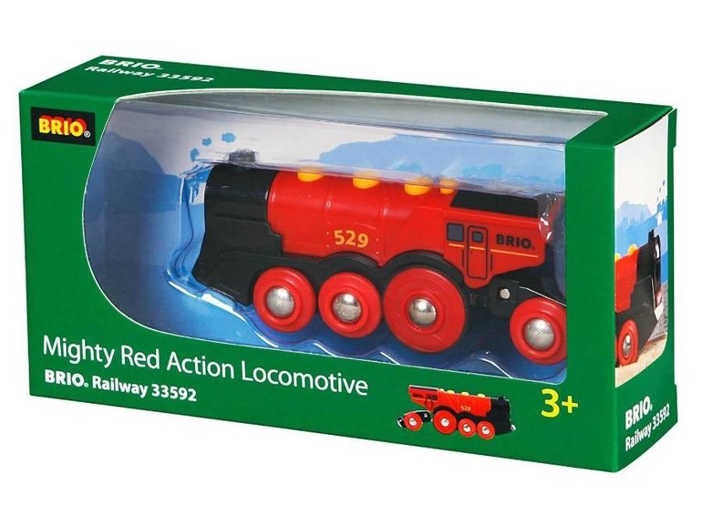 Паровоз железной дороги BRIO (БРИО), красного цвета, способен сам ездить по рельсам. На крыше паровоза находится переключатель направления движения. При движении у паровоза горят огни и он издаёт характерные звуки для паровоза, который тянет тяжело гружёный состав (если перевести эти звуки на русский язык, то получится - Чо-Чо-Чо-Чо...)