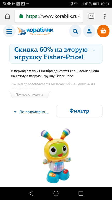Распродажи. Скидки. Акции.Девочки,в кораблике -60% на вторую игрушку Фишер прайс.Мне подтвердили 2 робота,каждый выходит по 2700