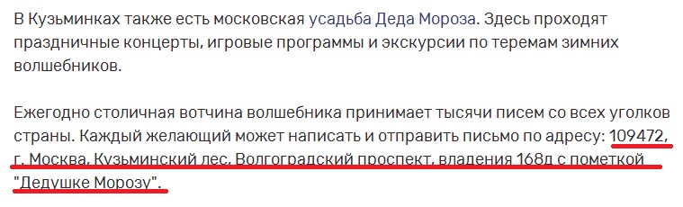 Письмо Деду Морозу в его резиденцию в Кузьминках
