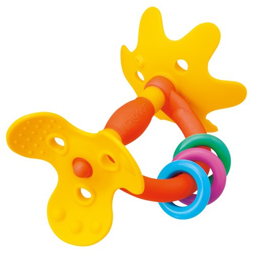 Попробуйте комфортер, его легче всего не потерять. Все остальные игрушки в этом возрасте сразу терялись у дочери, а комфортер можно было положить на животик и она его руками загребала в рот.