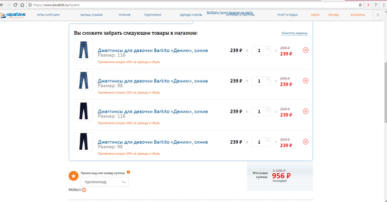 Распродажи. Скидки. Акции.Дочки носили подобные джеггинсы уже в прошлом году, но покупала я их дороже. Сейчас решила еще купить. По качеству мне нравятся, садятся хорошо, одевать легко, без всяких молний и т.п. Дочка любит такое, чтобы "натянул и побежал", особенно цена меня устроила, на распродажу еще плюс 20% скидка при добалении в корзину высвечивается. Флоктори не прошел у меня, но и так неплохо (по 239 руб получается). Вот ссылка на акцию Забрала свой заказ. Разница между 110 размером и 116 составляет 4 см, добавила фото. Сверху пережившие много стирок джеггинсы 110 размера, снизу новые - 116 размера