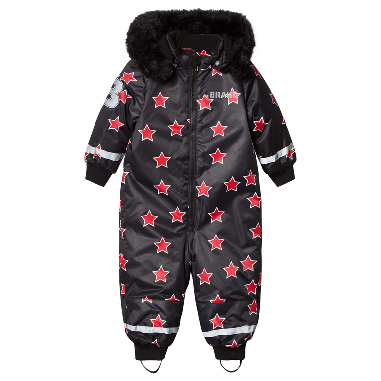 Coverall в Red Allstar With Black Fur, разработанным шведской одеждой для детей марки BRAND, создавая городскую моду с игривым поворотом.