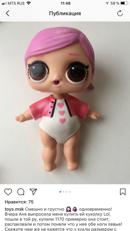 Ну не знаю, правда. Той.ру официально продаёт Лол-ов именно оригинал. В голову только фантастические версии лезут вроде продавцы в самом магазине "левый" товар сбывают по полной цене, а потом оригиналы перепродают или девушка, купив оригинал, решила "подкинуть" свой фейк, чтобы обменяли как брак ещё на один оригинал). По фото там не только ноги левые, но и куча ещё недочётов.