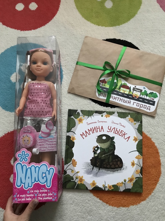 1.Наш самый лучший друг Андрюша-магнитный конструктор на холодильник и книга Мамина улыбка (все друзья одного возраста-около трёх лет) и соседка-подружка Варвара-кукла Нэнси