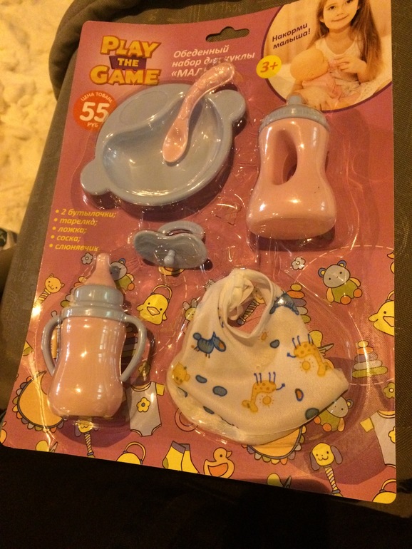 Пупс (небольшой,сантиметров 25) и к нему: стульчик для кормления,ванночка с аксессуарами,кроватка,переноска,бутылочка с молоком,набор детской посуды с соской,конверт для пеленания,горшок с памперсами и два комплекта одежды!!!