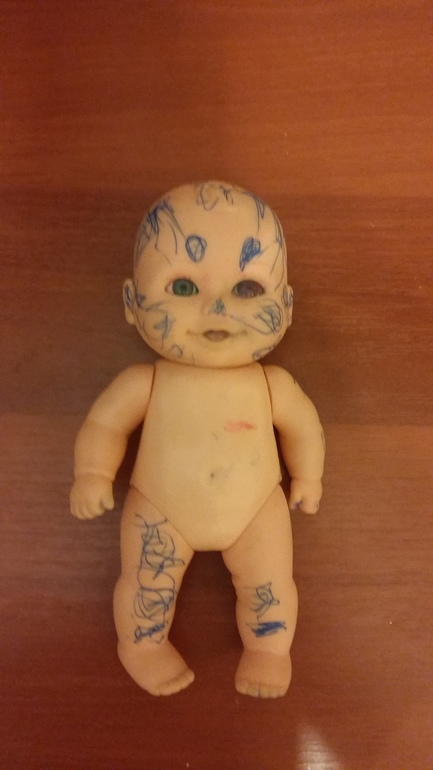По-моему и выкинуть будет не жалко,если мы поступим также как и с другим пупсом-раскрасим ручкой ему все тело!😂😂