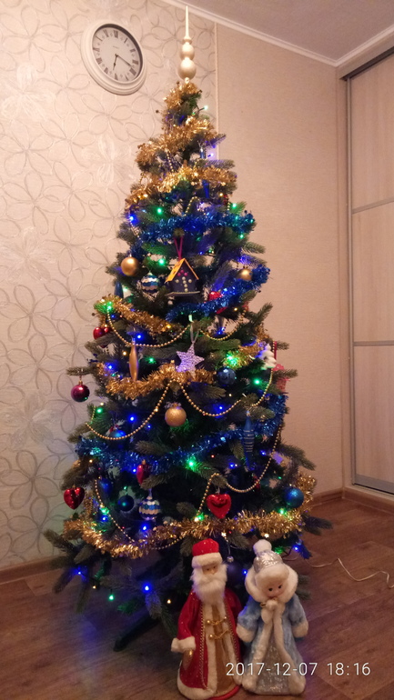 У меня игрушки все стеклянные, поэтому не наряжали, только гирлянды, да и ёлка закреплена к подоконнику