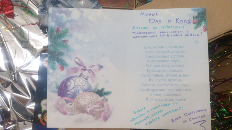 Наша дорогая Снегурочка из Саратова, огромное спасибо Вам и Вашей семье! Всего Вам самого светлого и родостного в наступающем 2018 году!