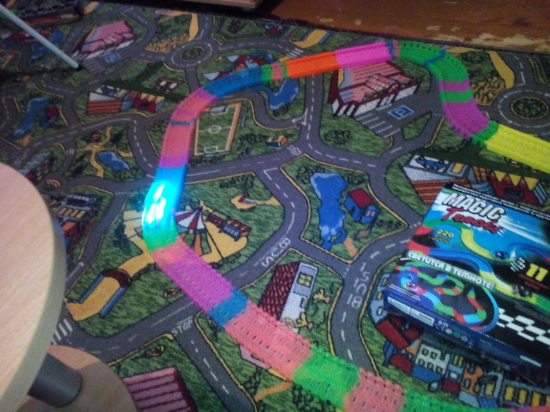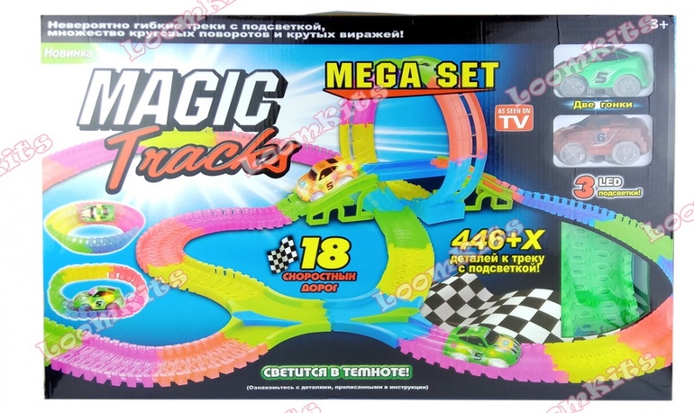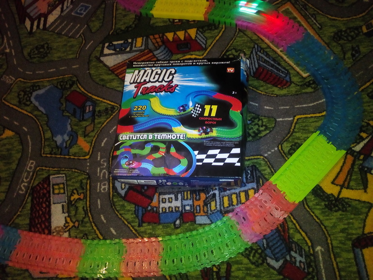 У нас супер набор на 446 деталей плюс петля плюс мост плюс развилка.2 машинки. В темноте трек светится. Правда не сильно, но мы и не держали его особо под светом. Открывали для проверки. Ждет НГ.3490