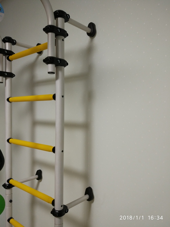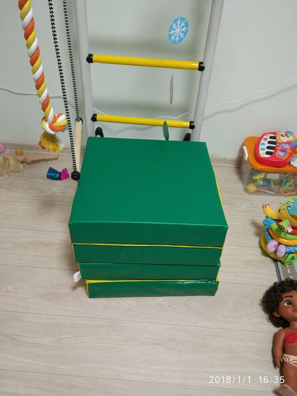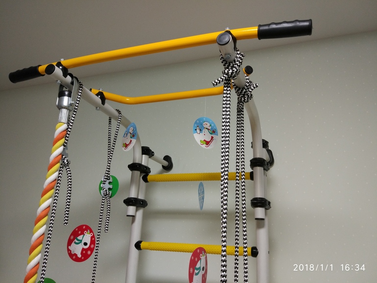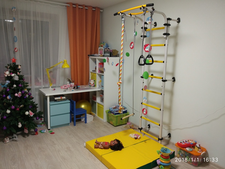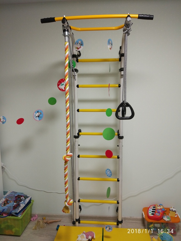 Давно решила дочке приобрести стенку, но как всегда- разнообразие поставило меня в тупик. Долго выбирала, смотрела, а потом случайно увидела на сайте дм и купила, со скидкой 1000 от 5000 вышло даже дешевле чем у других. Называется карусель комета некс 1. Подарили на новый год, поэтому как будет в эксплуатации, не знаю)) несколько дней, как поставили- дочка в восторге)) и канат, и кольца, и трапеция, которую приспособили как качели- ей все понравилось. По габаритам небольшая, вписалась в комнату на мой взгляд хорошо. Ступени с пупырышками, ноги не скользят. У стене крепится в 6 местах, надеюсь не отвалится)) в общем производит нормальное впечатление) но не для большого веса- турник все же не для взрослых- 100 кг заявлено, но наш дедушка весом столько подтягивался, турник чуть провисает. Для детей самое то)) и понравились маты- складываются пуфиком) цена стенки 7300, маты 2300) ну и фото (извиняюсь за беспорядок).