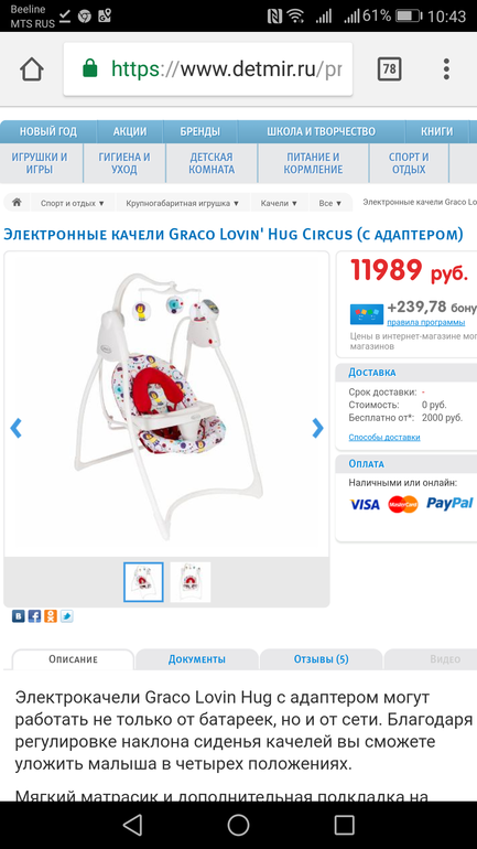 у нас такие у обоих сыновей были. и досыпать рано утром укладывала туда, и в течение дня могли и поспать и просто посидеть с игрушками. не обязательно в космос отправлять на 6 передаче, можно на 1-2 просто успокоительный режим включать, если не на сон. в общем, как помощник маме - хорошая вещь. младшего за 8 месяцев ни разу не укачивала на сон на руках, хотя качелями пользуемся. то есть прямой зависимости "качели=дальнейшее укачивание" не прослеживается