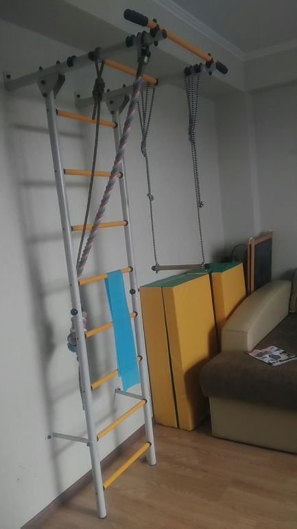 У нас г-образный деревянный, с креплением к стене, название не помню. Многое устраивает, но не всё. Если бы брала снова, то взяла бы, где у колец и трапеции есть реальная возможность раскачаться, не сталкиваясь со стенкой. Т.е., например, П-образный. Точно не Г и не Т. Вот ниже фотографии с такой же проблемой, у Маши Фабианы, например. Честно, не знаю, как они кольцами и трапецией полноценно пользуются. Тем более, там ещё и баскетбольное кольцо.