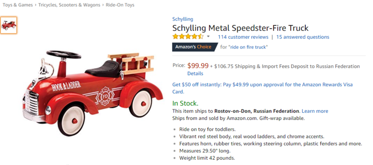 есть и в РФ, но дороже https://bunnyhill.ru/catalog/detskaya-pozharnaya-mashina-baghera-speedster-dlya-detey-1-3-let/ Есть курьерская доставка, оплата налом и бзналом. На этом сайте в наличии 1 штука. 14.700 р.